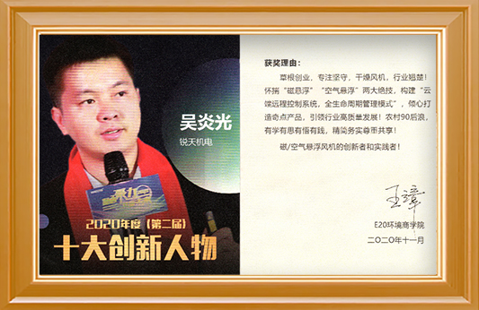 1、雷茨总经理吴炎光荣获环境商学院2020届“十大创新人物”,倾心打造奇点产品“空气悬浮风机”和“磁悬浮风机”;